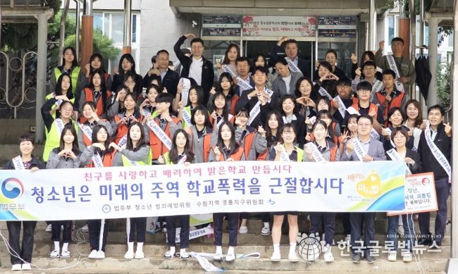 (한국글로벌뉴스 - 박소연 기자) 수원시 영통구는 14일 동수원중학교 정문에서 법무부 청소년범죄예방위원 수원지역 영통지구위원회(이하 ‘범방위’, 회장 이윤희)와 동수원중학교 재학생, 교직원, 학부모회 등 50여명이 참여하여 ‘등굣길 청소년 선도 캠페인’을 실시했다.