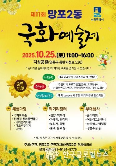 (한국글로벌뉴스 - 박소연 기자) 수원시 영통구 망포2동 주민자치회는 오는 10월 25일, 영통구 지성공원에서 제11회 국화예술제를 개최한다. 태장동부터 이어져온 이번 축제는 지역주민이 함께 어울리고 즐길 수 있는 참여형 문화행사로 국화포토존, 친환경 공예품만들기 체험부스, 먹거리 장터, 플리마켓 등 다채로운 프로그램이 마련될 예정이다.