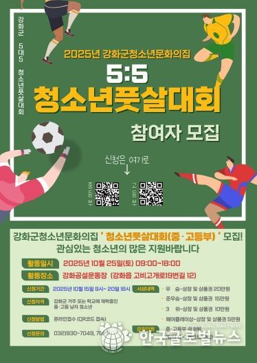 (한국글로벌뉴스 - 박지형 기자) 강화군시설관리공단(이사장 박영길)에서 운영하는 청소년 문화의 집이 오는 15일~20일, 관내 중․고등 남학생을 대상으로 강화군 청소년 풋살대회 참가자(팀)를 모집한다고 밝혔다.