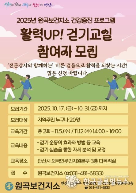(한국글로벌뉴스 - 박소연 기자) 안산시 단원보건소 원곡보건지소는 오는 31일까지 ‘맞춤형 건강 프로그램 ’활력UP! 걷기교실’ 참여자를 모집한다고 16일 밝혔다.