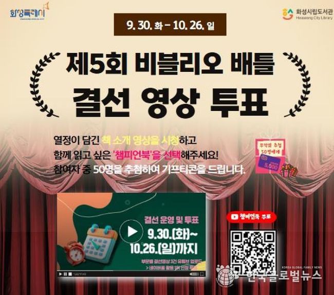 (한국글로벌뉴스 - 박소연 기자) 화성시문화관광재단은 오는 10월 26일까지 '제5회 비블리오 배틀' 결선 영상투표를 진행한다.