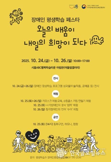 (한국글로벌뉴스 - 박소연 기자) 시흥시는 오는 10월 24일부터 26일까지 3일간, 시흥ABC행복학습타운 아람관과 어울터 일원에서 ‘2025 장애인 평생학습 페스타’를 개최한다.