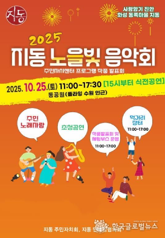 (한국글로벌뉴스 - 박소연 기자) 오는 10월 25일, 수원시 팔달구 지동 동공원(지동 267-12)에서 활력 넘치는 가을날을 아름다운 음악과 주민들의 열정으로 채울 특별한 축제, ‘2025 지동 노을빛 음악회·주민자치센터 작품발표회’가 열린다.