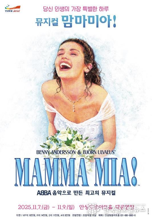 (한국글로벌뉴스 - 박소연 기자) 안성맞춤아트홀은 오는 11월 7일부터 9일까지 대공연장에서 세계적인 히트 뮤지컬 '맘마미아!'를 무대에 올린다. 세대를 초월한 명곡과 유쾌한 스토리로 사랑받아온 이번 작품은 남녀노소 누구나 즐길 수 있는 최고의 힐링 뮤지컬이다.
