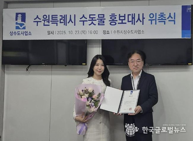 (한국글로벌뉴스 - 박소연 기자) 수원특례시는 리포터 이단비를 ‘수돗물 홍보대사’로 위촉했다. 위촉식은 23일 수원시 상수도사업소 소장실에서 열렸다.