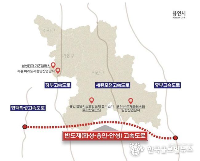‘반도체 고속도로’는 이동·남사읍의 첨단시스템반도체 국가산업단지와 원삼면의 용인반도체클러스터를 동서로 연결하는 핵심 산업축으로 경부고속도로, 국토45호선, 포천~세종 고속도로, 중부고속도로와 연결된다.