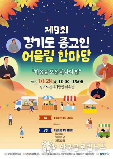 (한국글로벌뉴스 - 박소연 기자) 경기도는 28일 경기도인재개발원 체육관에서 ‘제9회 경기도 종교인 어울림 한마당’을 개최했다. 이번 행사는 불교, 천주교, 개신교 등 3대 종교가 함께 참여해 이웃 종교에 대한 이해를 높이고, 종교적 차이를 넘어서는 소통과 화합을 도모하기 위해 마련됐다.