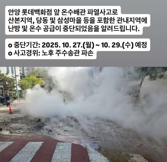 (한국글로벌뉴스 -박소연 기자) 27일, 지역난방 열수송관 파열사고가 발생한 범계역 인근 현장에 대해 군포시는 긴급하게 관내지역에 난반 및 온수공급 중단을 알렸다.