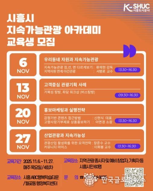 (한국글로벌뉴스 - 박소연 기자) 시흥도시공사는 시흥시의 지역 관광 전문가를 양성하기 위한 ‘시흥시 지속가능관광 아카데미’를 개설하고, 이에 따른 교육생을 모집한다고 밝혔다.