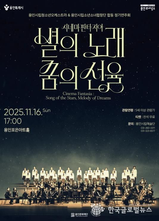 (한국글로벌뉴스 - 박소연 기자) (재)용인문화재단은 오는 11월 16일 용인포은아트홀에서 용인시립청소년오케스트라와 용인시립소년소녀합창단 합동 정기연주회 '시네마 판타지아 : 별의 노래, 꿈의 선율'을 개최한다.