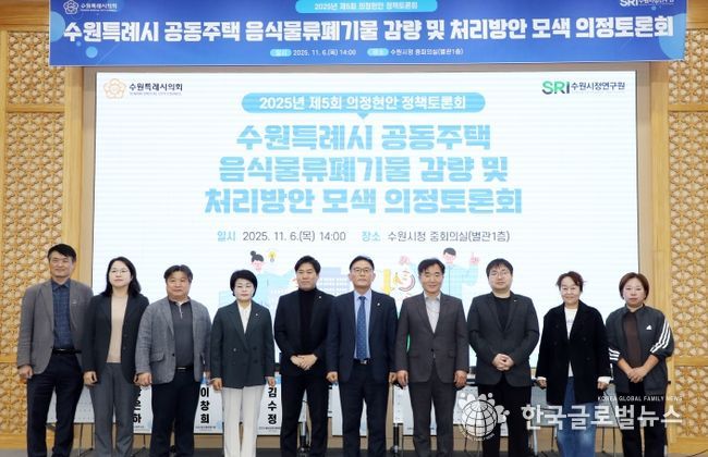 (한국글로벌뉴스 - 박소연 기자) 수원특례시의회 환경안전위원회는 11월 6일, 오후 2시, 수원시청 별관 1층 중회의실에서 ‘공동주택 음식물류폐기물 감량 및 처리방안 모색’이라는 주제로 의정토론회를 개최했다.