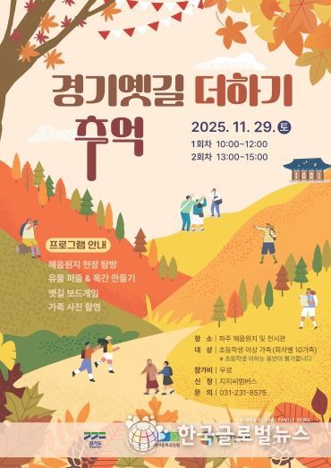 (한국글로벌뉴스 - 박소연 기자) 경기문화재단 경기역사문화유산원는 오는 11월 29일 토요일, 의주길에 위치한 파주 혜음원지 일대에서 초등학생 이상 자녀를 둔 가족을 대상으로 하는 역사 체험 프로그램 ‘경기옛길 더하기 추억’을 개최한다고 밝혔다.