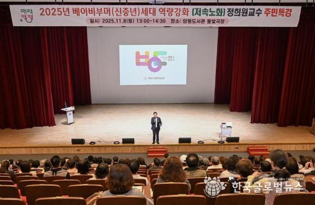 (한국글로벌뉴스 - 박소연 기자) 양평군은 지난 8일 양평도서관 물빛극장에서 ‘베이비부머세대(신중년) 정희원 교수 초청 저속 노화 분야 주민 특강’을 개최하며 성황리에 마무리했다.