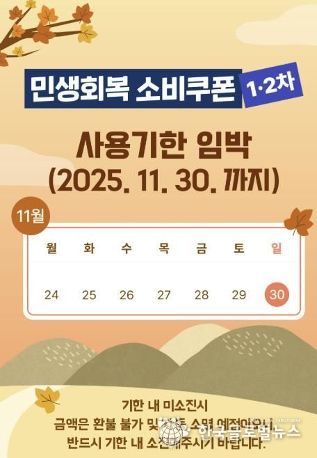 (한국글로벌뉴스 - 박소연 기자) 가평군은 주민생활 안정과 지역경제 활성화를 위해 지급된 ‘민생회복 소비쿠폰’의 사용기한이 오는 11월 30일로 종료된다며, 군민들에게 기한 내 적극적인 사용을 당부했다.