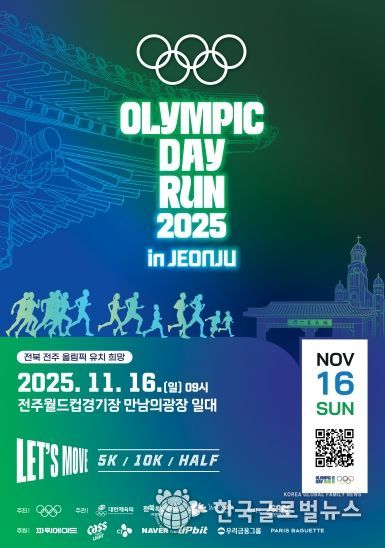 11일 전주시에 따르면 ‘올림픽데이런’은 IOC 창설일(1894년 6월 23일)을 기념해 올림픽 가치 확산을 목적으로 각국 올림픽위원회가 주관하는 글로벌 캠페인으로, 이번 행사는 IOC가 주최하고 전북특별자치도·전주시·대한체육회가 주관하는 마라톤 대회 형식으로 꾸며진다.