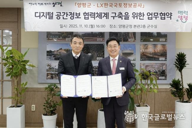 (한국글로벌뉴스 - 박소연 기자) 양평군은 지난 10일 LX한국국토정보공사와 ‘디지털 공간 정보 협력체계 구축을 위한 업무협약(MOU)’을 체결하고, 군민이 체감할 수 있는 스마트 행정 서비스 확대에 나섰다.