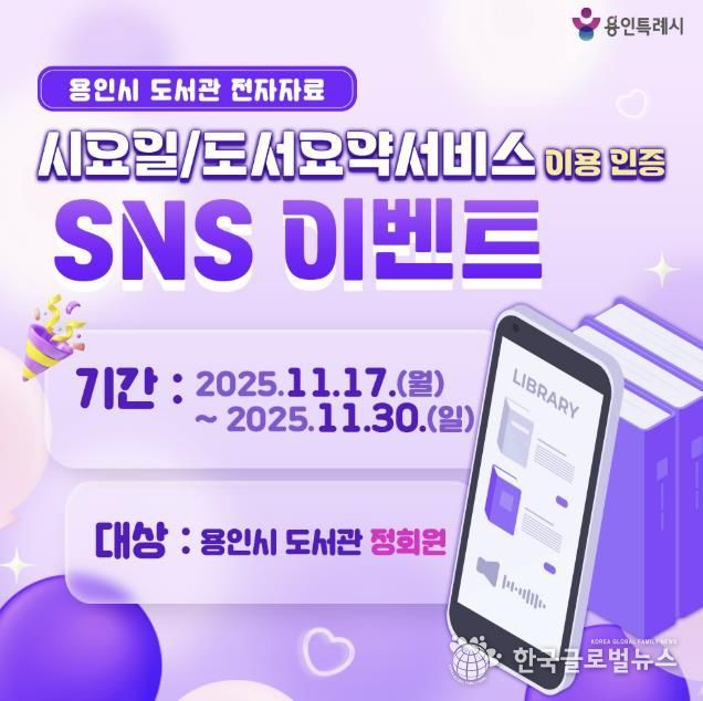 (한국글로벌뉴스 - 박소연 기자) 용인특례시는 용인시도서관 전자자료인 시요일과 도서요약서비스 이용자를 대상으로 사회관계망서비스(SNS) 이벤트를 운영한다고 14일 밝혔다.