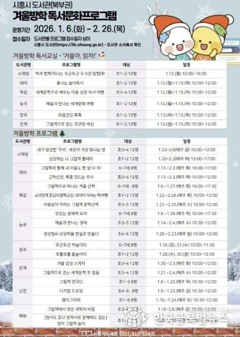 (한국글로벌뉴스 - 박소연 기자) 시흥시는 겨울방학을 맞아 북부권 8개 공공도서관(소래빛ㆍ대야ㆍ목감ㆍ능곡ㆍ장곡ㆍ은계ㆍ신천ㆍ매화)에서 1월 6일부터 2월 26일까지 겨울독서교실 및 겨울방학 프로그램을 운영한다.