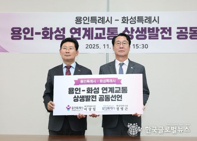 (한국글로벌뉴스 - 박소연 기자) 화성특례시와 용인특례시는 21일 고양시청 백석별관 투자회의실에서 ‘화성-용인 연계교통 상생발전 공동선언문’을 발표하고, 반도체 메가시티의 핵심 축으로서 양 도시가 긴밀히 협력할 것을 천명했다.
