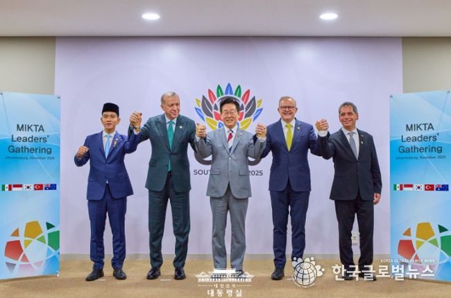 (한국글로벌뉴스 - 박소연 기자) 주요 20개국(G20) 정상회의 참석을 위해 남아프리카공화국을 방문한 이재명 대통령은22일(현지시간) 오후 우리나라, 멕시코, 인도네시아, 튀르키예, 호주 5개국으로 구성된 믹타(MIKTA) 회원국 정상들과 회동했다.
