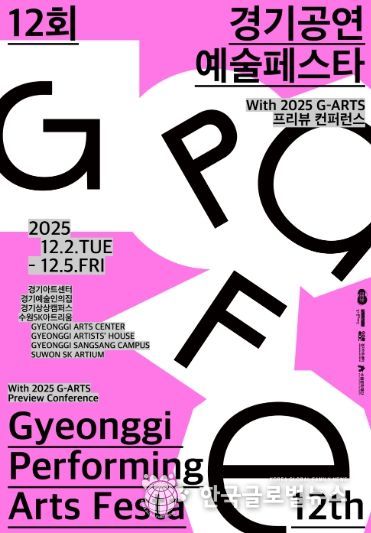 (한국글로벌뉴스 - 박소연 기자) 경기문화재단은 경기도 수원 일대에서 제12회 경기공연예술페스타를 개최한다. 페스타는 2025년 12월 2일부터 5일까지 경기 예술인의 집, 경기아트센터, 경기상상캠퍼스, 수원SK아트리움 등에서 진행되며, 베스트콜렉션, 쇼케이스 데이, 공동 창·제작 쇼케이스, 피치세션, 토크세션, 워크숍 등 다양한 프로그램을 통해 경기 공연예술 생태계의 흐름과 성과를 한눈에 보여줄 예정이다. 또한 경기아트센터 주최 ‘2025 G-ARTS 프리뷰 컨퍼런스’가 동시 개최되며, 보다 풍성한 전문 교류의 장을 마련한다.