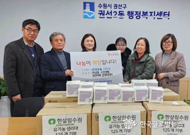 (한국글로벌뉴스 - 박소연 기자) 수원시 권선구 권선2동행정복지센터는 3일 한살림 수원생협 권선지역 운영위원회로부터 여성 위생용품(생리대) 125팩을 기부받았다고 밝혔다.