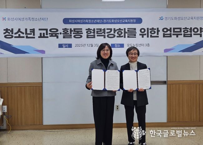 (한국글로벌뉴스 - 박소연 기자) 경기도화성오산교육지원청은 2025년 12월 3일, 모두누림센터에서 화성시여성가족청소년재단과 ‘지역 연계 교육·청소년 활동 강화를 위한 업무협약식’을 체결하고, 화성다가치 공유학교 운영을 중심으로 지역 자원을 활용한 학교 밖 배움 지원 체계를 본격 강화해 나가기로 했다.