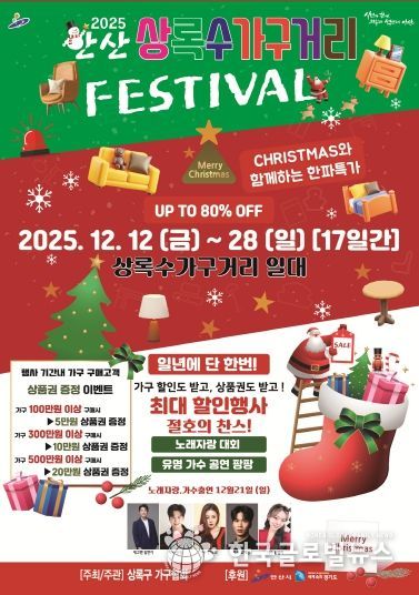 이민근 안산시장은 “지역 대표 특화상권인 상록수 가구거리에서 열리는 연말 축제에 많은 시민이 함께해 주시길 바라며, 이번 행사가 지역상권 활성화에 실질적인 도움이 되길 기대한다”고 말했다.