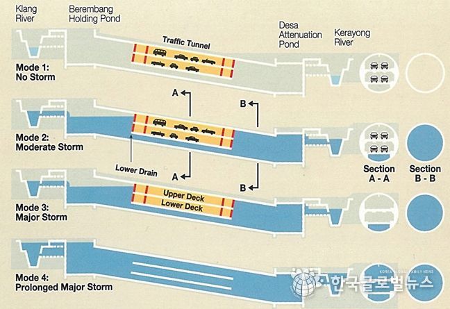 말레이시아 정부는 비가 오면 수시로 넘쳤던 클랑강 범람을 막고 평상시에는 쿠알라룸푸르 시내 교통 정체를 해소하기 위해 2007년 복합터널 ‘SMART’를 건설했다. 일정 강우량 이상 비가 내리면 차량 통행을 통제하고 하천 유량을 조절하는 통로로 사용한다.