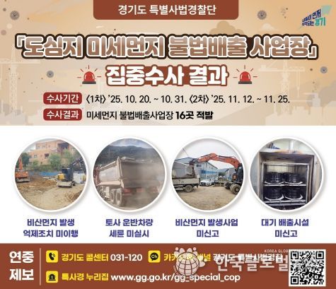 (한국글로벌뉴스 - 박소연 기자) 경기도는 도심지 미세먼지 발생사업장 330개를 대상으로 불법 배출 행위를 집중 수사해 대기환경보전법 위반 사업장 16개를 적발했다고 9일 밝혔다.