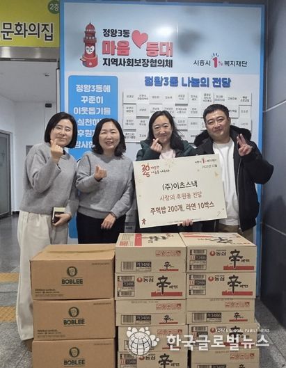 (한국글로벌뉴스 - 박소연 기자) ㈜이츠스낵은 지난 12월 19일 정왕3동 지역사회보장협의체를 찾아 저소득 결식 우려 가구를 위한 주먹밥 200개와 라면 10상자를 전달했다.