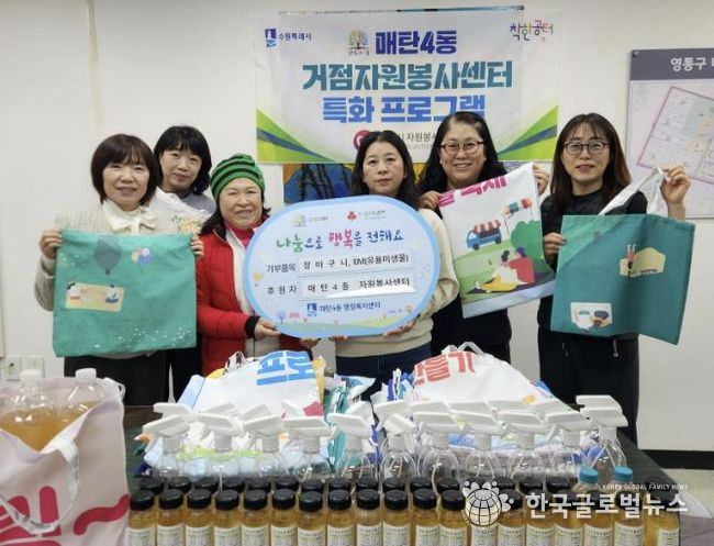 (한국글로벌뉴스 - 박소연 기자) 수원시 매탄4동 자원봉사캠프 코치와 봉사회원들은 지난 12월 19일, 지역 상권 활성화와 마을 공동체 활성화를 위해 회원들이 직접 만든 장바구니와 EM(유용 미생물)을 매탄4동 행정복지센터에 전달했다.