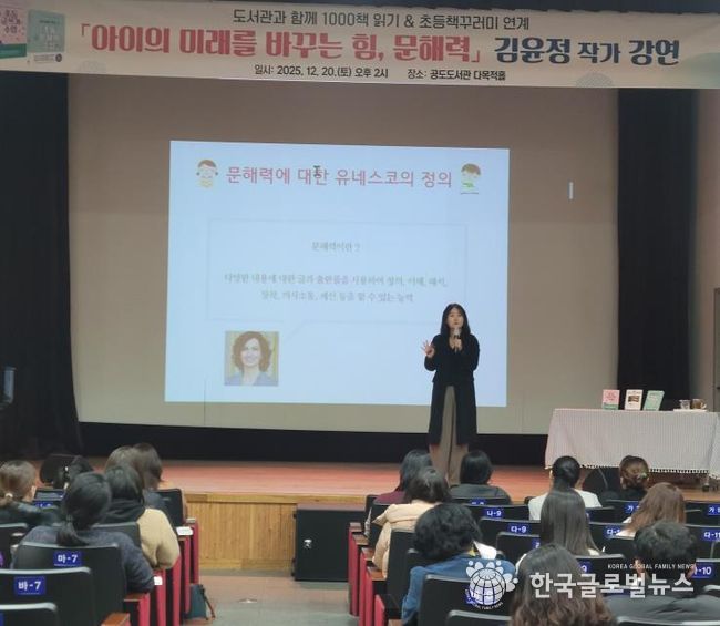 (한국글로벌뉴스 - 박소연 기자) 안성시 공도도서관은 지난 20일 오후 2시 ‘도서관과 함께 1000책 읽기’ 및 ‘초등 책꾸러미’참여자 부모와 문해력에 관심있는 시민을 대상으로 김윤정 작가 초청 강연 '아이의 미래를 바꾸는 힘, 문해력'을 개최했다.
