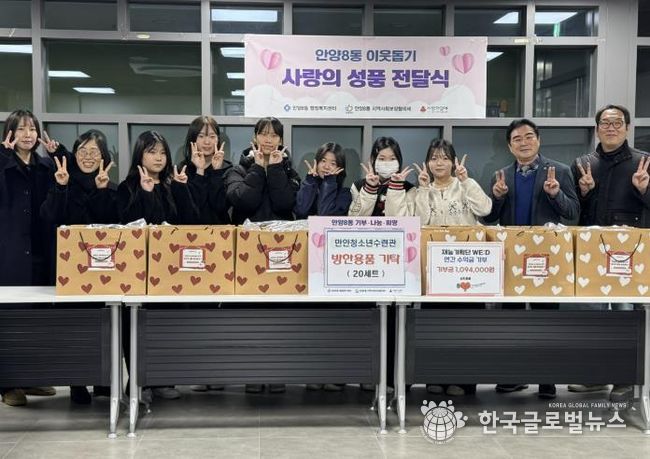 (한국글로벌뉴스 - 박소연 기자) 안양시 만안구 안양8동 행정복지센터에 따르면 지난 18일 만안청소년수련관의 청소년 자치활동 프로그램 ‘재능기획단’이 관내 혼자 생활하는 어르신들에게 전달해달라며 센터에 1,094,000원 상당의 방한용품 20세트를 기탁했다고 23일 밝혔다.
