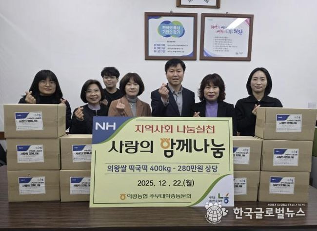 (한국글로벌뉴스 - 박소연 기자) 의왕농협 주부대학총동문회는 12월 22일, 회원들의 뜻을 모아 떡국떡 400kg(280만원 상당)을 부곡동주민센터에 기탁하며 어려운 이웃을 위한 나눔을 실천했다.