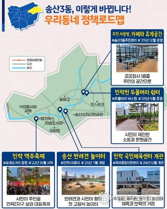 송산3동에는 주민이 머무르며 교류하고, 지역에 활력을 더하는 생활 인프라가 차근차근 확충되고 있다. 행정시설 앞 유휴공간부터 하천변, 상권, 교통 인프라까지 이어지는 변화는 송산3동의 생활 반경을 넓히고 있다.