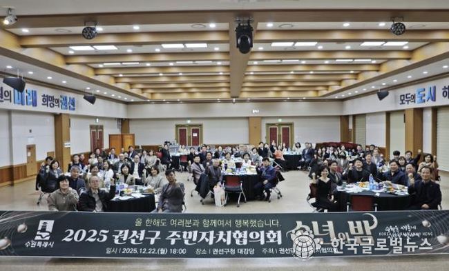 (한국글로벌뉴스 - 박소연 기자) 권선구 주민자치협의회는 2025년 12월 22일 오후 6시, 권선구청 대회의실에서 '2025 권선구 주민자치협의회 송년회'를 개최했다.