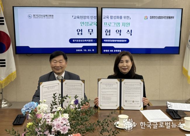 (한국글로벌뉴스 - 박소연 기자) 경기도안산교육지원청은 12월 23일 오후 3시 30분, 따뜻한인성함양국민운동본부와 학교 현장의 인성교육 강화와 도덕성 회복을 위한 지역 연계형 인성교육 지원 체계 구축을 위한 업무협약(MOU)을 체결했다.