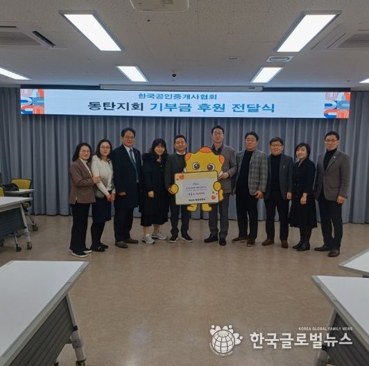 (한국글로벌뉴스 - 박소연 기자) 화성특례시는 한국공인중개사협회 화성동탄지회(초록·중앙·리베라·호수·청계회 포함)에서 24일 화성시 동탄출장소를 방문해 어려운 이웃을 돕기 위한 기부금 619만 원을 기탁했다고 밝혔다.