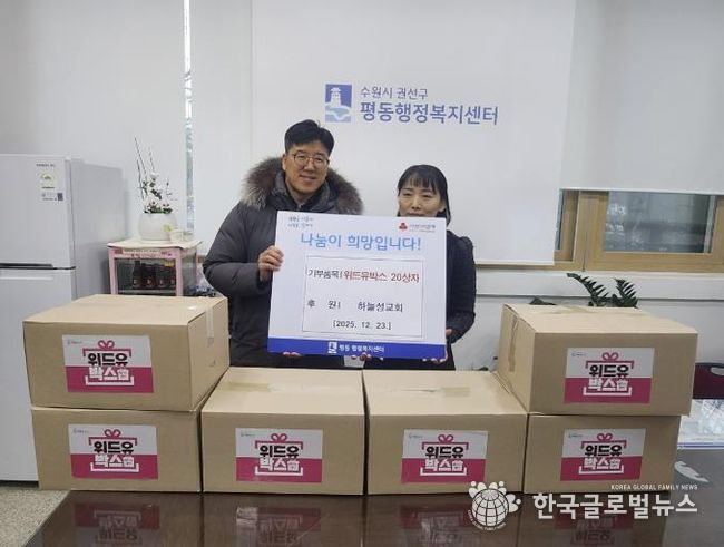 (한국글로벌뉴스 - 박소연 기자) 수원시 권선구 고색동 소재 하늘성교회는 지난 23일 성탄절을 맞이하여 '위드유박스' 21박스를 평동 행정복지센터에 전달했다.
