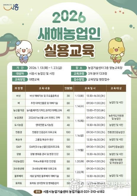 (한국글로벌뉴스 - 박소연 기자) 시흥시는 농업인의 전문역량 강화와 안정적인 영농 활동을 지원하기 위해 ‘2026년 새해농업인 실용교육’을 오는 1월 13일부터 23일까지 시흥시농업기술센터 3층 영농교육장에서 운영한다.