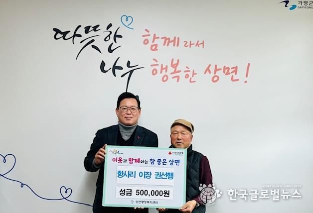 (한국글로벌뉴스 - 박소연 기자) 매년 성금 기부를 통해 나눔을 실천해 온 가평군 상면 항사리 권선행 이장이 올해도 변함없이 상면 행정복지센터에 성금 50만원을 기탁했다.