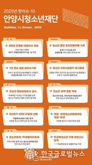 (한국글로벌뉴스 - 박소연 기자) 안양시청소년재단은 올 한 해를 돌아보는 ‘2025년 안양시 청소년재단 핫이슈 10’을 선정하고, 2025년 청소년 정책 컨트롤타워로서의 기능을 강화해 청소년 체감형 정책 성과를 거뒀다고 30일 밝혔다.