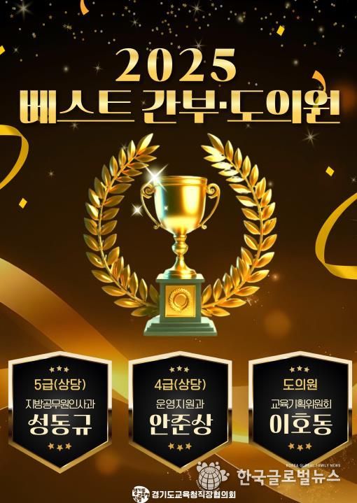 (한국글로벌뉴스 - 박소연 기자) 경기도교육청 직장협의회는 소통과 협력을 기반으로 한 조직문화 정착과 활기찬 직장 분위기 조성을 위해 '2025년 베스트 간부 및 경기도의원'을 선정했다고 12월 30일 밝혔다.