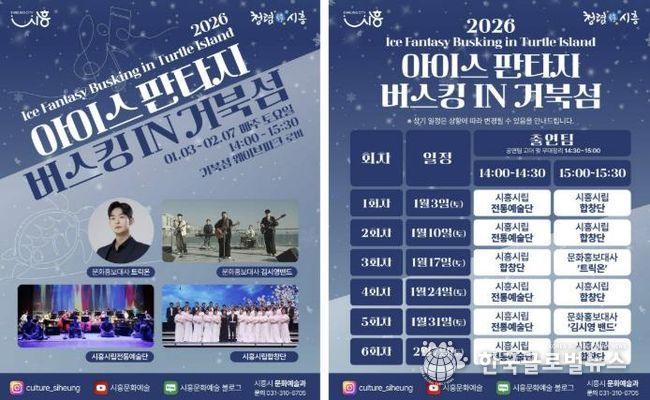 (한국글로벌뉴스 - 박소연 기자) 시흥시는 지난 연말에 진행된 ‘2025 시흥 사운드 오브 윈터’의 열기를 잇는 후속 문화예술 프로그램으로, 겨울철 거북섬을 찾는 시민과 관광객에게 풍성한 즐길 거리를 제공하고자 ‘2026 아이스 판타지 버스킹 인 거북섬’을 운영한다.