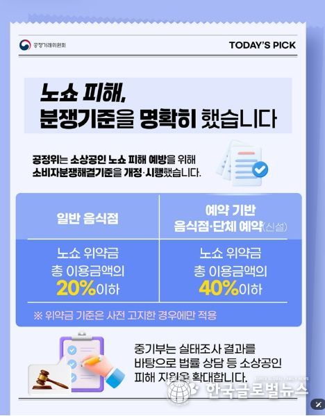 (한국글로벌뉴스 - 박경희 기자) 공정위는 소상공인 노쇼 피해 예방을 위해 소비자분쟁해결기준을 개정·시행했습니다.