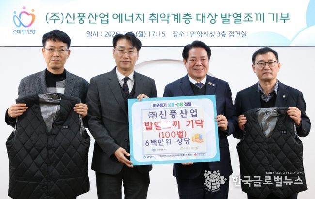 (한국글로벌뉴스 - 박소연 기자) 안양시는 5일 오후 5시 15분 시청 3층 접견실에서 관내 기업인 ㈜신풍산업이 지역 저소득층 및 에너지 취약계층의 겨울철 생활 안정을 돕기 위해 발열조끼 100벌(600만원 상당)을 기탁했다고 밝혔다.