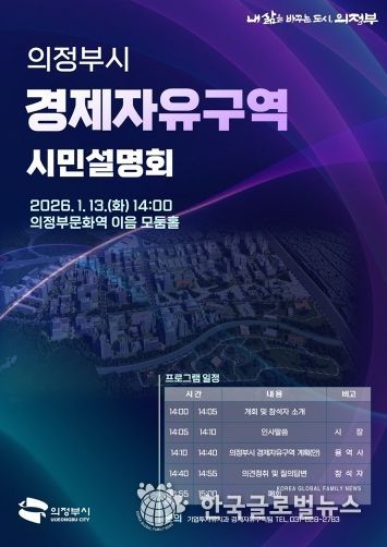 (한국글로벌뉴스 - 박종욱 기자) 의정부시는 1월 13일 의정부문화역 이음에서 경제자유구역 지정 추진과 관련한 시민설명회를 개최한다.