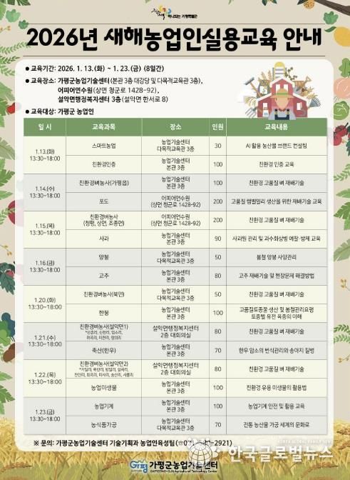 (한국글로벌뉴스 - 박소연 기자) 가평군농업기술센터가 농업인의 영농 역량 강화를 위해 ‘2026년 새해농업인실용교육’을 오는 1월 13일부터 23일까지 실시한다.