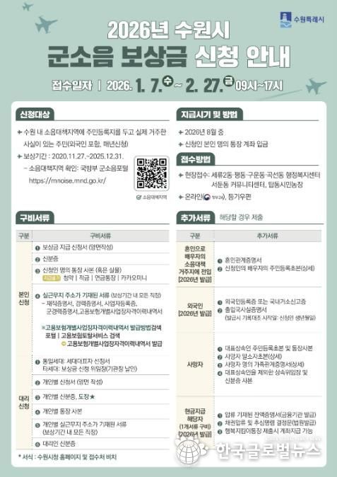 (한국글로벌뉴스 - 박소연 기자) 수원특례시는 2월 27일까지 ‘2026년 군소음 피해보상금’ 신청을 받는다.